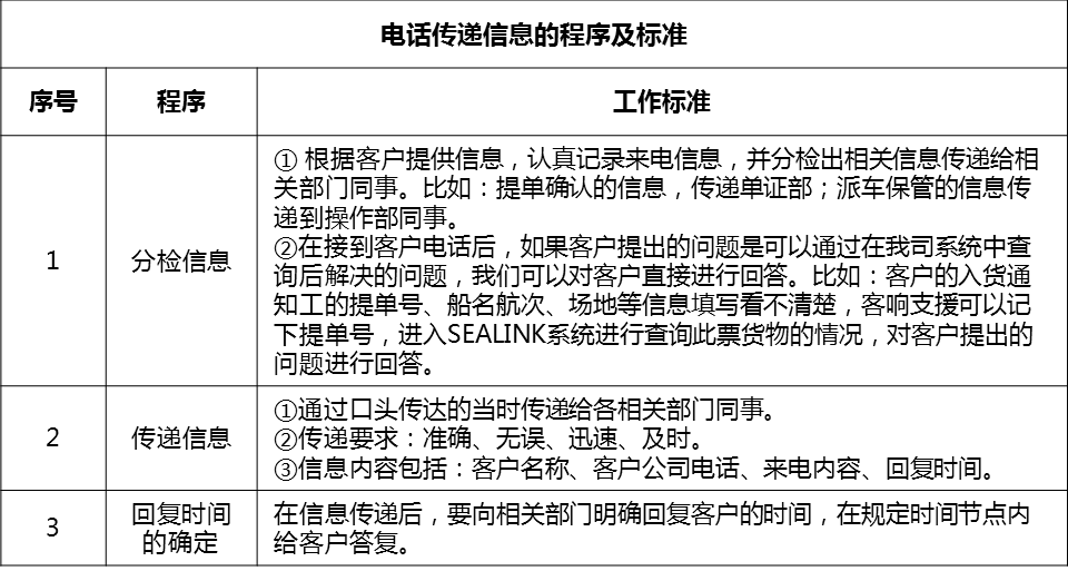 进行固化信息传递点的工作规范设计。由于客响中心人员在与客户或相关配合岗位沟通过程中,会遇到各种各样的不同问题,如何在各种信息传递过程中实现用语的更为专业化和职业化,是体现客响中心人员价值的关键所在。华恒智信通过信息传递的不同方式(如电话、邮件、短信息平台等)角度,分别设计了相应的传递信息的程序与标准,将信息传递过程中的关键点加以固化,如:电话传递信息的程序与标准中,首先确定分拣信息、传递信息、回复时间的确定这几个程序,进而再确定各个程序中的工作标准(详见下图)。同时,将电话沟通中的用语加以规范,针对经常会遇到的各种问题,提出规范的回答。如:遇到客户询问“什么时候可以背箱,在网上看不到信息?”的问题时,其规范的回答就是:“请问提单号是?稍等(客响联系操作),您好,操作已经与码头联系好了,随时可以背箱,网络系统有问题所以没显示”。