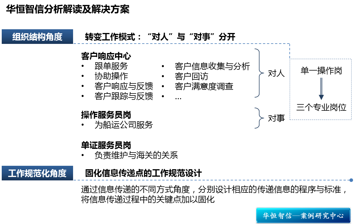 从该物流公司操作员岗位的工作内容来看,虽然是为客户提供货物信息的查询服务,但是还会牵扯到很多不同性质的“对人”和“对事”的工作,当不同性质的工作混合到一起的时候,对这个岗位人员的能力要求就会相对较高,且一旦处理不好,就会对公司整体工作带来影响。针对这个问题,华恒智信顾问团队从组织结构的角度加以分析并提出建议: