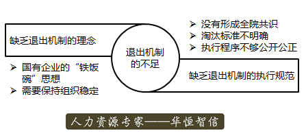 在这种情况下,设计院决定借助专业机构的力量,通过前期联络,举行招标,邀请到华恒智信的专家顾问团,达成合作意向,对设计院当前面对的人力资源管理问题进行诊断,并提供解决方案。华恒智信的专家顾问团入驻设计院后,通过对设计院高层领导、部门负责人、基层骨干进行了深入的访谈和调研,查阅分析了现有的制度文件,并指出有晋升就一定要淘汰,有提升肯定就会有退出。设计院传统的“能进不能出”的管理机制严重影响了设计院运营的活力,再加上目前还没有形成一个完善的评价机制,员工工作积极性有待激发,部门间工作效率较低,工作做好做坏得到的结果差不多。造成这种现象的主要原因是没有建立起一套符合设计院自身的退出机制。但是退出不等于辞退,在像设计院这样的国有设计院是有特殊含义的。当前的设计院中,表现出来的在退出机制上的不足主要包含以下两个方面: