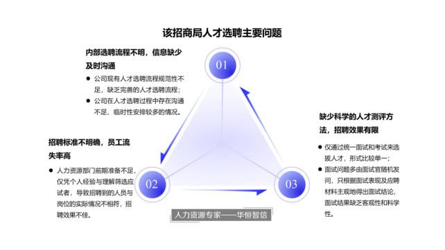 为进一步了解该单位在人员选聘方面存在的问题,帮助其制定与完善人员选聘流程,华恒智信的专家老师通过访谈、问卷等形式,对该单位的实际情况做了深入调查和分析,发现该单位在选聘方面存在以下问题: