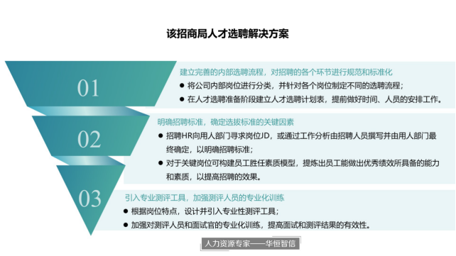 通过对该单位的人才选聘管理现状进行深入分析,华恒智信的专家老师帮助其制定与完善了人员选聘流程,并针对单位现存问题提出了以下解决方案: