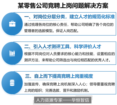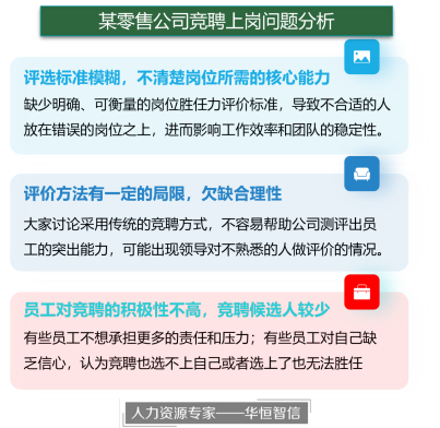 随着公司的不断发展,承接的业务渠道和数量持续增加,对优秀人才数量和质量的要求也随之提高。近几年由于线上平台的发展,公司需要更多的优秀人才来支持公司的线上零售渠道的日常管理和运营;对于线下实体门店来说,业务种类增加,业务的复杂程度也增加,因此公司需要综合素质和能力都比较突出的管理人才。在此背景下,公司希望建立内部竞聘机制,来满足公司对优秀人才的需求,一方面,内部竞聘的方式,公司更了解员工的真实情况,可以针对性的选出合适的人才;另一方面,内部员工更了解公司的经营情况,对上岗后的适应度比较好。但在实际开展中,该公司面临了一些问题,比如,公司内部员工对竞聘积极性不高,大家都不愿意承担更大的责任;评价出来的人才可能不是最适合该岗位的,上岗一段时间后,发现并没有推动业绩发展……针对这些问题,该公司决定与华恒智信人力资源咨询公司达成合作,帮助公司开展管理人才竞聘上岗项目,以此来适应公司未来发展。