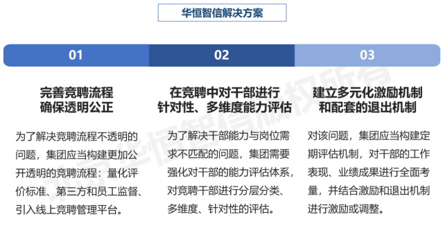 华恒智信项目组通过实地考察、调研及访谈,识别出企业当前存在的三大主要问题:竞聘流程缺乏足够的透明度和公正性、配套的激励机制与退出机制尚不完善、干部能力与岗位需求存在不匹配。针对这些核心问题,项目组提出了一系列切实可行的解决方案。该集团积极响应,完善竞聘流程,确保选拔过程的公开透明;建立多元化的激励机制和健全的退出机制,激发干部的工作热情并保障队伍的活力;同时,强化对干部的能力评估与培训,确保每位干部都能与岗位需求高度契合。这一系列举措的实施,将充分发挥干部竞聘的积极作用,为企业精准选拔出最合适的干部,并将其放置在最适合的位置上,从而最大化地发挥人力资源的效能。