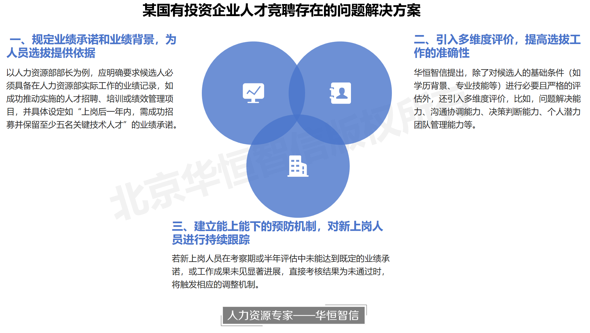 在本次项目中,由于该集团的不断发展,亟需选拔出一批核心人才支持集团转型,但是公司之前的竞聘工作存在一些问题,无法有效选拔出合适的人才,比如凭借基础条件选拔,无法选出合适人才;缺少科学的人员选拔工具,选拔结果准确性受限;能上不能下,人员退出困难。针对这些问题,华恒智信提出,规定业绩承诺和业绩背景,为人员选拔提供依据;引入多维度评价,提高选拔工作的准确性;;建立能上能下的预防机制,对新上岗人员进行持续跟踪。