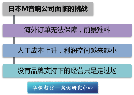 然而,此次金融危机引发的世界范围内的经济危机,使产业结构进入激变时期。此时,因为来自欧美汽车厂商的海外订单量萎缩,M音响公司单纯靠汽车厂家下订单的业务模式受到很大的局限,加之劳动力市场的成本也水涨船高,使公司面临生存的巨大威胁。华恒智信专家团队深入该公司进行访谈与调研,并结合音响OEM配套制造商的行业发展状况,认真分析了该公司目前所面临的挑战。