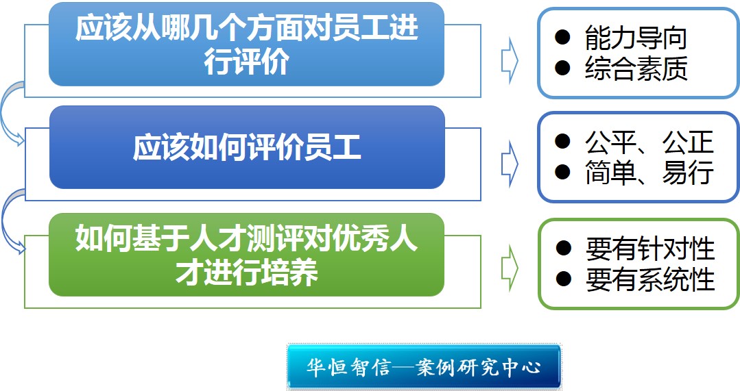 通过与该设计院不同层级的人员进行多次深入访谈和分析,华恒智信顾问专家了解到,目前该设计院欠缺一套科学合理的人员评价体系,领导在评价员工时更多的是依赖主观印象,而且不同人员对员工的评价标准也有较大的差异,举例来说,小王和小李分别是A部门和B部门的一名普通员工,在进行人员评价时,由于A部门领导的要求较为严格,小王的综合打分为80分,而B部门的领导要求相对较低,小李的综合打分可能是90分,但实际上,客观来讲可能小王的综合能力比小李要好一些。这就产生了不公平的现象,员工也私底下抱怨,也有员工反映,“会干活不如会表现”,甚至该设计院形成了一股在领导面前争相表现的风气。在领导困惑不知道该怎么评价员工的同时,员工也迷惑自己的发展和提升方向,不知道公司鼓励员工做哪些工作或是怎样做工作,也不知道哪些工作行为是不好的。