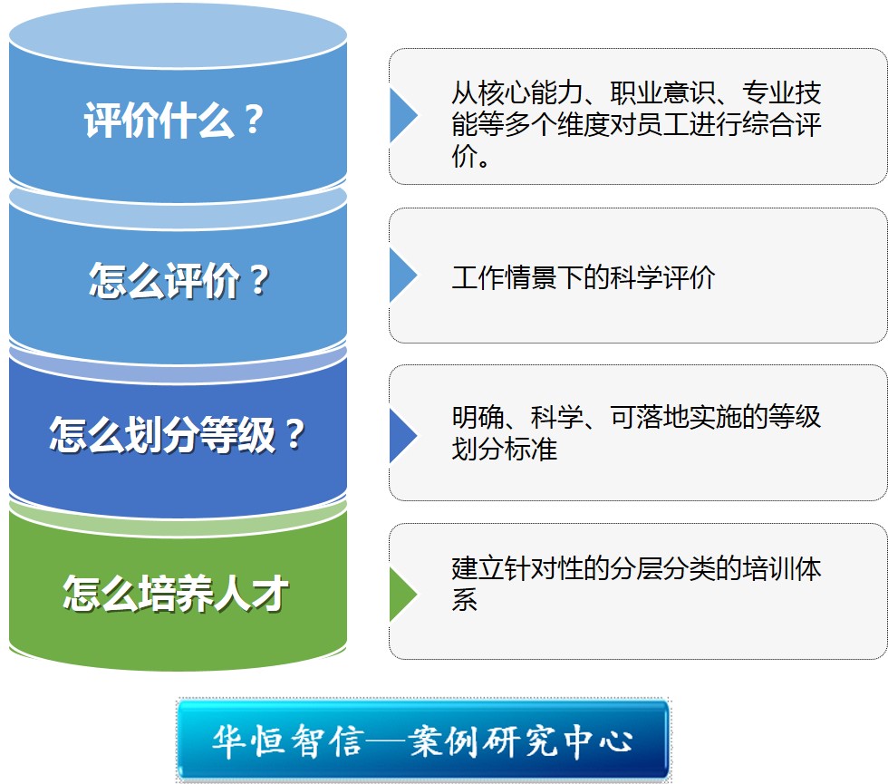 针对“评价什么”的问题,华恒智信专家顾问团队指出,从核心能力、职业意识、专业技能等多个维度对员工进行综合评价。其中,职业能力包括解决问题能力、执行力、谈判力等,职业意识包括成本意识、安全意识、自律等,专业技能根据各岗位所需要的核心工作技能确定。