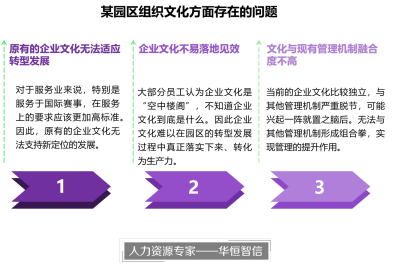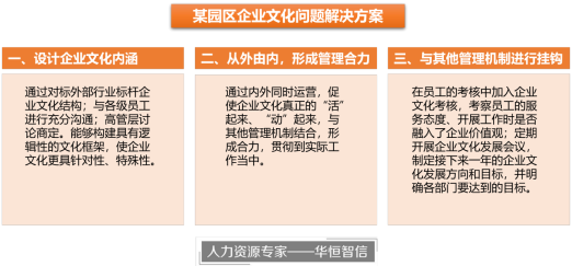 各个企业都清楚企业文化的重要性,但是实际操作中,都面临着难以落地、空喊口号的问题。在本案例中,随着该园区的转型发展,定位由生产类企业转型为服务类企业,在此过程中,原有的企业文化无法支持转型后的定位;企业文化流于形式,对工作本质没有提高作用;企业文化与其他管理机制脱节。针对这些问题,华恒智信建议搭建企业文化内涵;从外由内,形成管理合理,促进企业文化落地;与其他管理机制进行挂钩,促进企业文化深入融合到管理工作当中。