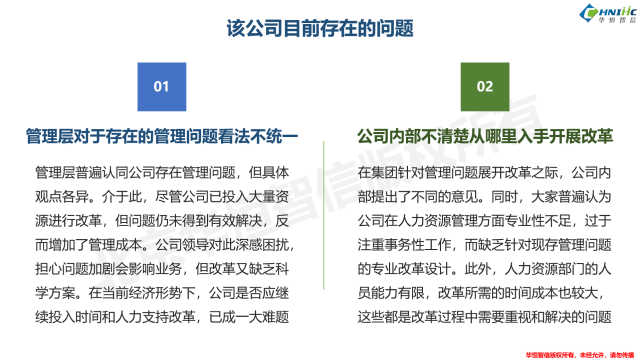 某互联网公司隶属于大型国企,是集团主要的经营增长利润中心。随着业务范围和客户数量不断扩大,该公司面临的管理问题也逐渐显现,难以满足企业的未来发展需求。公司领导想改变现状,但通过公司的初步梳理发现,单位在薪酬、绩效、组织结构、定岗工作等方面都有缺陷,例如人员流动性大、薪资结构不合理、部门间忙闲不均情况严重等,导致公司领导难以入手改革。为了更好地对现有管理进行优化与调整,实现降本增效,该公司与北京华恒智信达成项目合作,共同开展人力资源管理诊断的设计和优化项目。