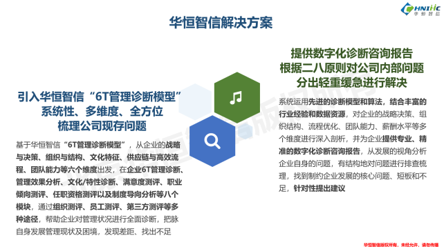 在本案例中,该企业管理层对管理问题有很多想法,但却无法统一方向,不知道从何入手。针对这一问题,华恒智信建议引入专业诊断分析模型,借助华恒智信人力资源管理诊断信息化系统,对公司进行系统科学的诊断,再根据问题的轻重缓急进行有序改变。