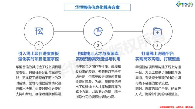 华恒智信项目组针对公司的现状,提出了以线上管理平台为核心的解决策略。首先,引入线上项目进度看板,通过实时追踪查看项目状态和任务分配,确保项目进度得到有效掌控。其次,构建线上人才与资源库,实现资源的优化配置和高效利用,解决资源分配不均的问题。最后,打造线上沟通平台,打破沟通壁垒,实现各部门与项目组之间的高效跨时空沟通,提升整体协作效率。