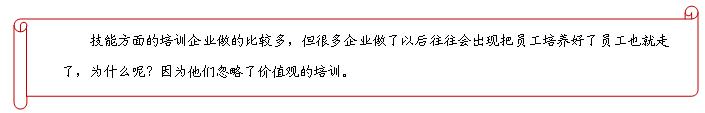 关于技能方面的培训企业做的比较多,但很多企业做了以后往往会出现把员工培养好了员工也就走了,为什么呢?因为他们忽略了价值观的培训,员工的忠诚度没有上去。什么是最好的员工,又红又专的员工,红是对企业要忠诚,专是专业能力很强能把工作做好。