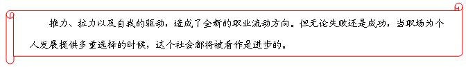 推力、拉力以及自我的驱动,造成了全新的职业流动方向。但现实并不一定一帆风顺。一份来自美国罗盛咨询公司(Russell Reynolds Associates)的调研报告显示,在过去多年中,有相当一批外企经理人,在加入本土企业后6个月甚至更短的时间内选择离开,生存率不高于50%.面对众多失败案例,职业经理人开始谨慎选择自己的发展平台,但是无论如何,当职场为个人提供了多重选择的时候,经理人的个性得以自由施展,社会才是进步的。