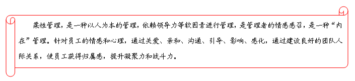 柔性管理,是一种以人为本的管理,依赖领导力等软因素进行管理,是管理者的情感感召,是一种“内在”管理。针对员工的情感和心理,通过关爱、亲和、沟通、引导、影响、感化,通过建设良好的团队人际关系,使员工获得归属感,提升凝聚力和战斗力。