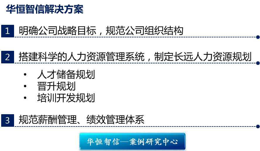 通过对该公司管理现状的分析及市场环境的深入调研,针对该公司所存在的问题,华恒智信顾问专家团队提出以下解决方案: