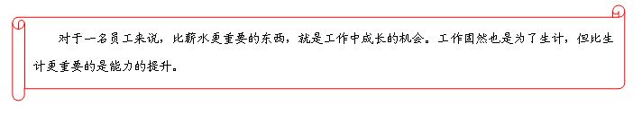对于一名员工来说,比薪水更重要的东西,就是工作中成长的机会。工作固然也是为了生计,但比生计更重要的是能力的提升。如果一个人的工作仅是为了工资的话,那么,可以肯定,他注定是一个平庸的人。