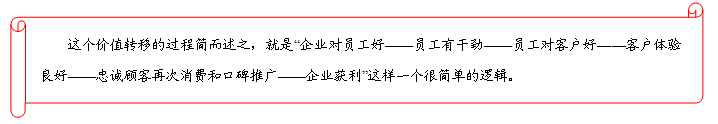 企业要想服务做得好,就需要员工首先乐意为顾客服务。所以从一开始,善待员工就是海底捞董事长张勇在内部管理中的一个导向。用中国式管理来定义的话,张勇对员工的管理及对客户的服务均可谓之“人性化”。这个价值转移的过程简而述之,就是“企业对员工好——员工有干劲——员工对客户好——客户体验良好——忠诚顾客再次消费和口碑推广——企业获利”这样一个很简单的逻辑。其实,在西方服务营销理论中,早就有一个对应的概念“服务利润链”。