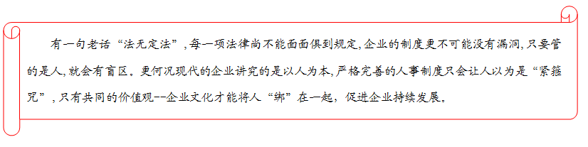 有一句话叫“法无定法”,每一个制度、每一项规定都存在一定的盲区。管理的对象是“人”,当企业处于初级发展阶段时,靠制度、组织结构无疑是最有效的方式之一,但当一个企业发展壮大为一个成熟的大型企业,地域覆盖全国,业务扩张至海外时,情况就有所变化。易于管理的人和事通过规则、制度就可以进行管理,但还有更多靠规则和制度管不住的人和事,此时就需要有共同的价值观即企业文化。一个企业的力量不是1+1的数量叠加,而是企业文化共同价值观下的成倍爆发。