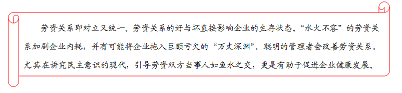很多企业像案例中福特公司的管理者和员工之间的劳资关系一度“剑拔弩张”。经过管理者的步步努力,逐步改善劳资关系,营造企业内部良好的工作氛围,提高员工对公司的认同度,降低了企业内耗,使企业不断发展。