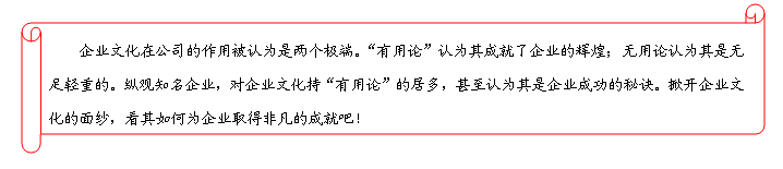 企业文化在各个公司中地位不一,有的认为举足轻重,有的认为流于形式。这种情况的造成在于企业文化通常是约定俗成、没有书面文件的规定,往往在于公司如何的对其利用。