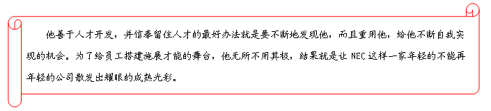 培养员工充分发挥“关心、体贴,联想、构思”等人的主观能动性,不断地追求工作结果的完美,造就一批终身受雇的员工,是人力资源部的使命之一。在NEC通讯随处可看到很多细小的环节做得很生动。员工的座位,用半透明的玻璃屏风隔开,即尊重了员工个性,又保留了沟通的余地;每逢下雨、下雪的时候,楼道的大理石地上就铺上了红地毯;饮水机旁张贴着“每节约一个纸杯,可以节约XX。”