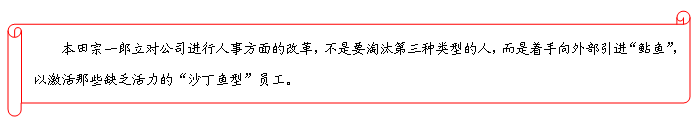 受此启发,本田宗一郎立即开始对公司进行人事方面的改革,不是要淘汰第三种类型的人,而是着手向外部引进“鲇鱼”,以激活那些缺乏活力的“沙丁鱼型”员工。
