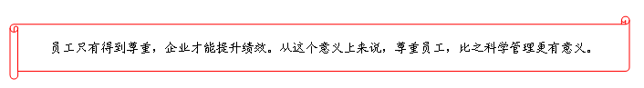 虽然“尊重”只有两个字,但对于企业的意义却是难以估量的。员工得到尊重,才有主动绩效,企业才有业绩。顾客得到尊重,才会回报股东。因此,老板服务于员工,员工服务于顾客的理念,正是基于对市场规律的深刻理解方能提出,这一点值得所有的企业思考借鉴。