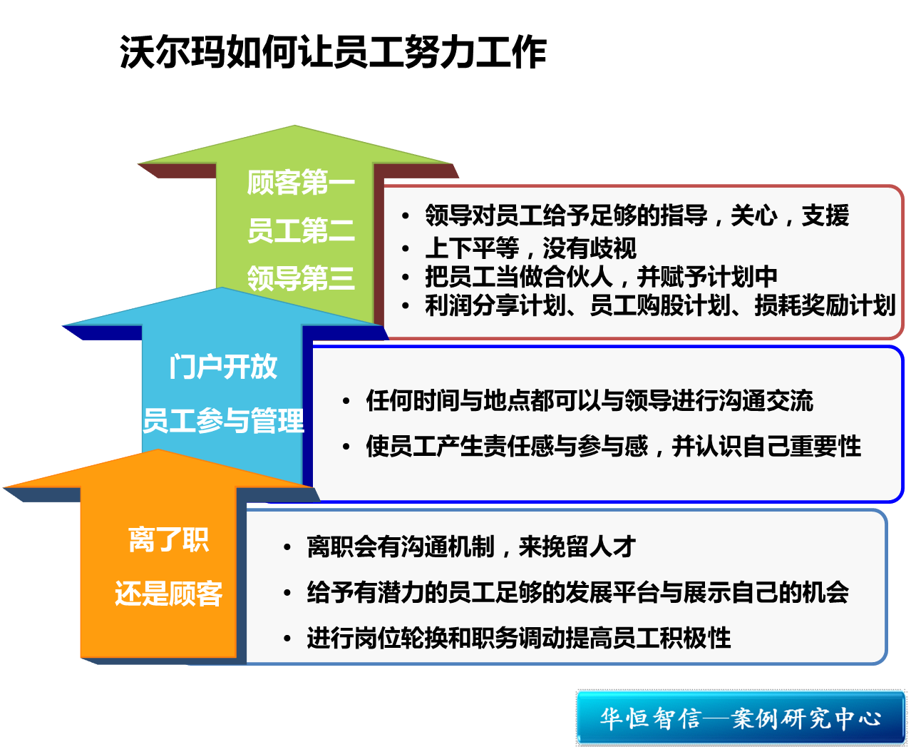 沃尔玛在处理员工关系上的经验可以概括为两个字——尊重。企业内部通过沟通机制、培训体系等精心构建出尊重员工的工作氛围。尊重首先意味着信任,财务、管理状况公开,全员参与管理,既达到了集思广益的效果,更满足了员工的被尊重需求,增强企业内部凝聚力。