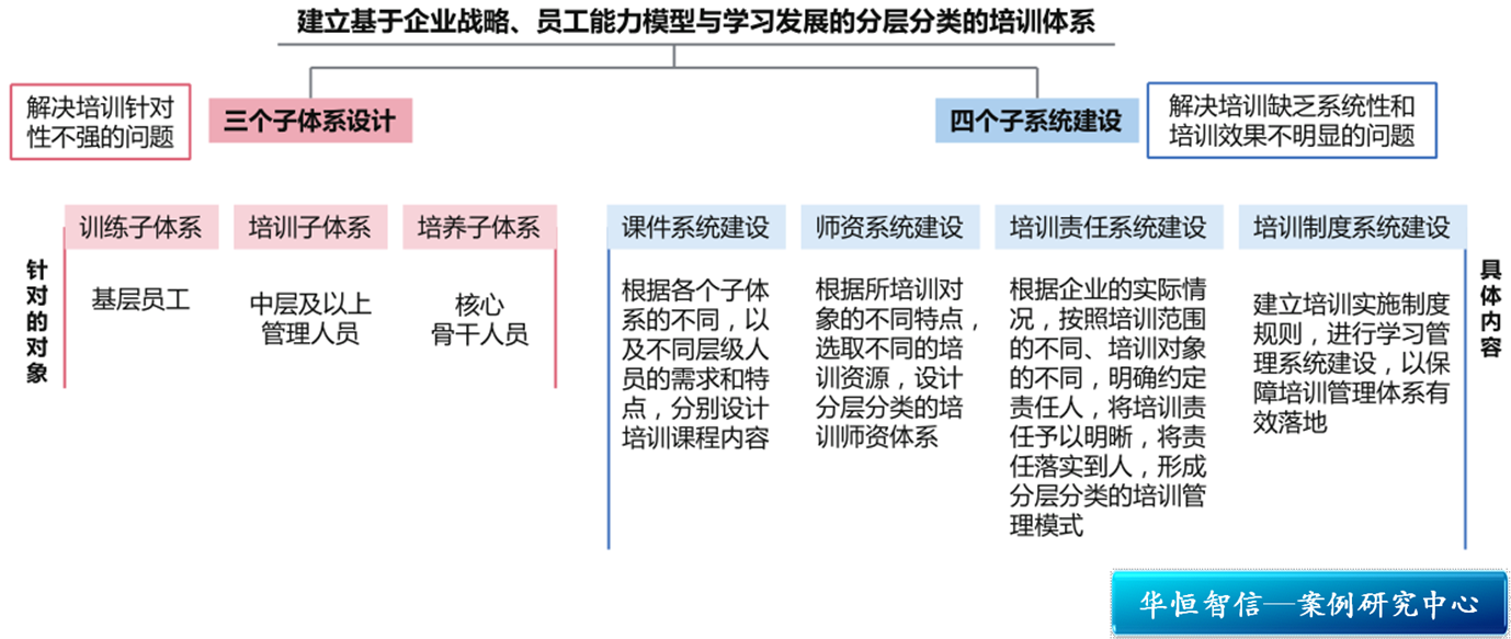针对该公司的需求状况,华恒智信顾问团队提出的培训体系构建思路为:建立基于企业战略、员工能力模型与学习发展的分层分类的培训体系,主要包括三个子体系设计(训练、培训、培养)和四个子系统建设(课件系统建设、师资系统建设、培训责任系统建设、培训制度系统建设)。