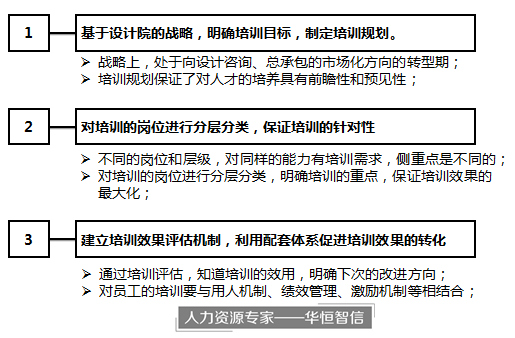 企业的发展进步依赖于人才的作用,战略转型的实现要靠人才的不断进步。具体到设计院中,培训体系的建立无疑是最快最有效最直接的培养人才的办法,针对现在培训管理中的问题,华恒智信的专家老师提出了以下办法: