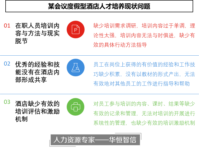 通过对酒店现状的调研与分析,华恒智信从人才培养的角度出发,对酒店在员工培养与后备干部储备方面存在的问题进行了总结:
