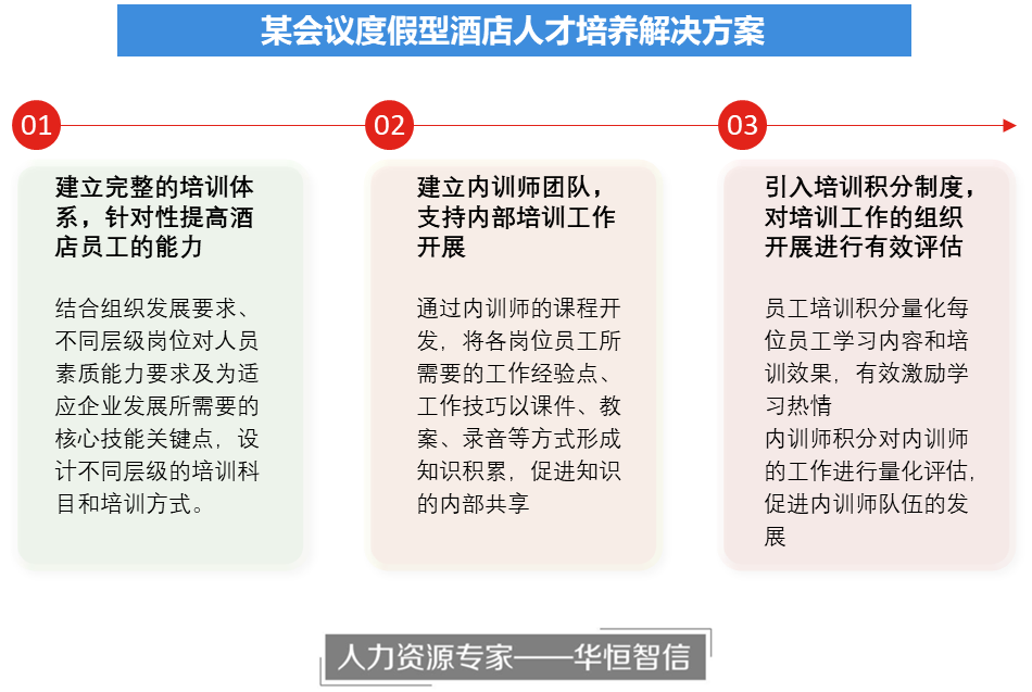 通过对该酒店培训工作开展情况和人才培养情况的调查分析,华恒智信结合酒店实际情况提出人才培养体系建设的方案规划。