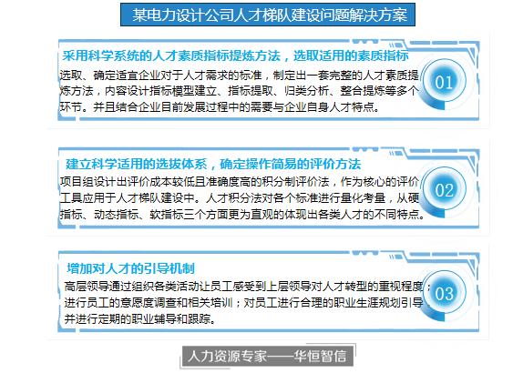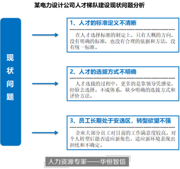 作为一家实力较强,人员素质较高,人才储备雄厚的大型电力设计公司,应该根据企业发展的转型需要,激活和挖掘企业内部人才的潜力,更好地发挥内部人才的作用,建立构建人才梯队,为公司人才成长提供一个更为广阔的平台。华恒智信顾问团队建议:在人才梯队构建的过程中,需要建立明确的人才选拔标准,形成完备的人才选拔机制。