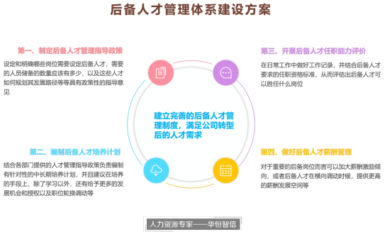 第四、做好后备人才的奖惩管理。一个完善的后备人才管理体系不仅要能够满足公司人才需求,还要能够给人才本身提供发展机会。华恒智信项目组提出,为了避免后备人才流于形式、大家缺少积极性的问题,建议在建立核心人才梯队时采取特殊薪酬扶持政策,也就是说对于重要的后备岗位而言可以加大薪酬激励倾向,或者后备人才在横向调动时候,提供更高的薪酬发展空间等,以此激励大家主动加入后备人才梯队,并且确保后备人才的队伍建设能够走的更长远,而非满足一时之需。