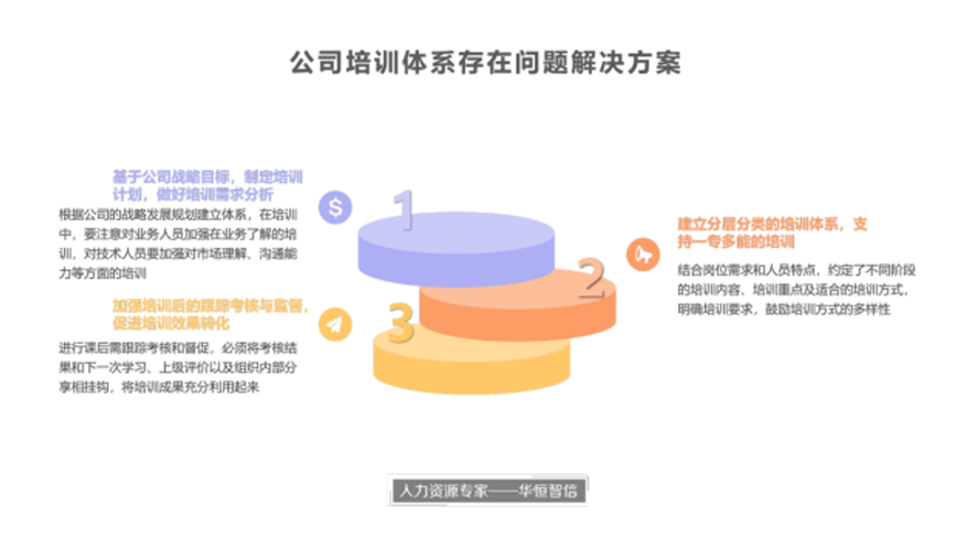 基于对该公司实际管理情况的深入了解,针对其员工培训体系所存在的问题,华恒智信顾问团队针对性地提出以下解决方案,帮助企业完善了员工培训体系。