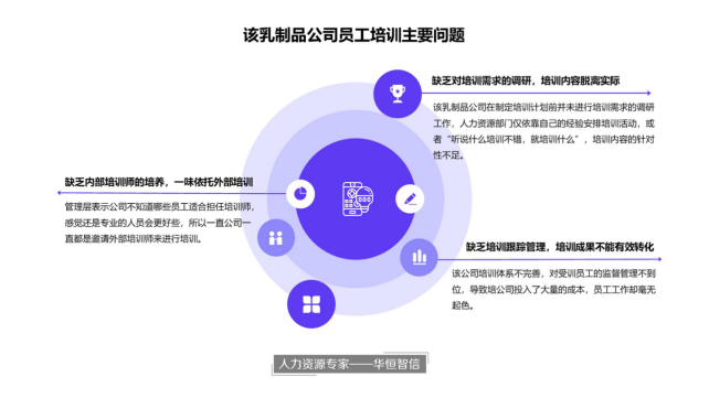 在与该乳制品公司的管理层进行初步沟通,对其咨询需求进行了解后,华恒智信的专家老师立即开始了全面的调研工作,了解到该公司在培训方面主要存在以下问题: