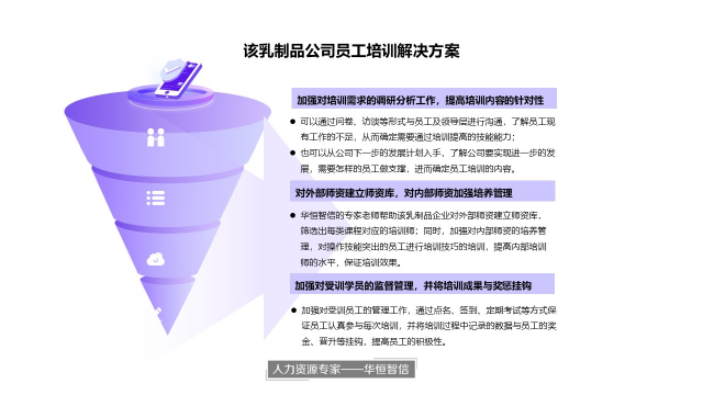 针对该乳制品公司员工培训体系存在的上述问题,华恒智信的专家老师经过商讨认为可以从以下几方面入手: