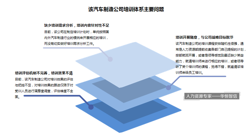 通过深入的访谈和分析,在深入了解该汽车制造公司实际情况的前提下,华恒智信的专家老师们指出,该汽车制造公司的员工培训体系存在以下几个方面的问题:
