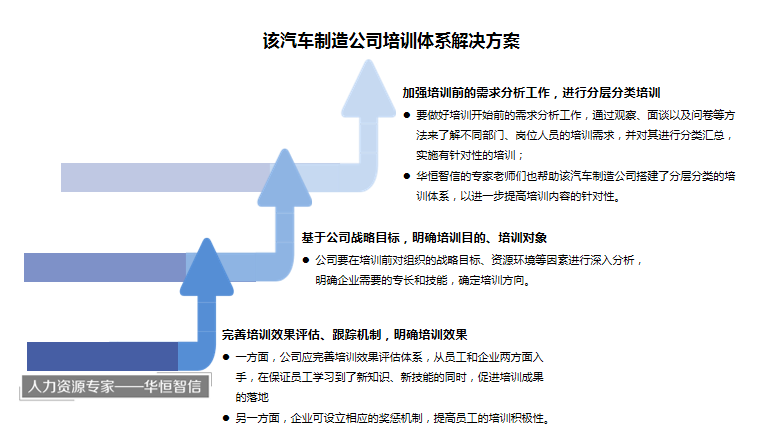 基于对该汽车制造公司实际情况的深入了解,针对其员工培训体系所存在的问题,华恒智信顾问团队有针对性的提出了解决方法,帮助该公司完善了员工培训体系。具体方案如下: