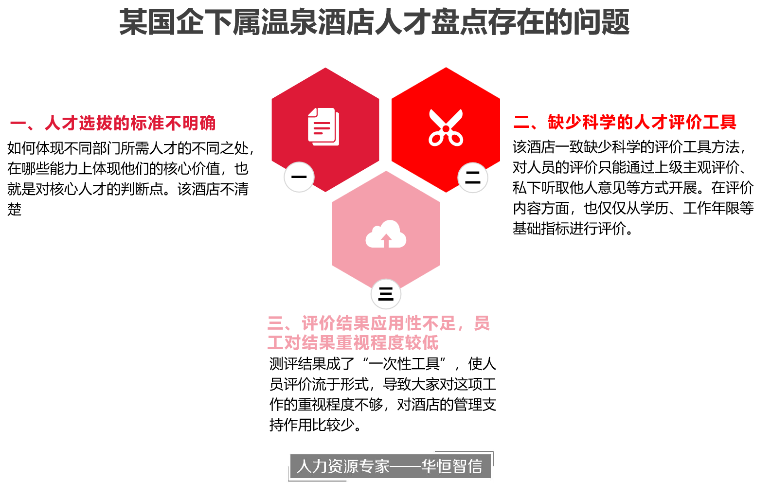 在本项目中,由于该酒店在未来两三年内,将面临许多资历深厚的技术人员、管理人员即将退休的情况。新员工将如何延续他们的工作成为当前需要解决的问题。华恒智信项目组通过实地调研了解到,该酒店以往的人才选拔工作存在一些问题,比如没有明确的标准、缺少科学的工具、评价结果后续应用不足,导致该酒店人才评价工作流于形式,后备人才培养工作始终没有成熟。针对这些问题,华恒智信建议,建立符合酒店发展要求下的人员评价依据,明确选拔标准;结合各岗位特点,采取不同测评方法;将评价结果与人员薪酬、考核、培训挂钩,支持其他管理工作。