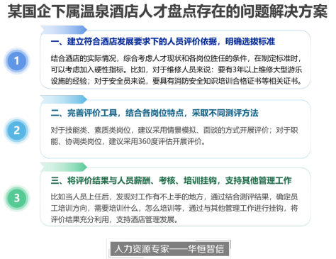 在对酒店的现状了解后,华恒智信的专家老师经过多次深入讨论,并结合多年实战经验,提出了一系列行之有效的解决方案,获得了该酒店领导的高度赞扬。具体解决方案如下: