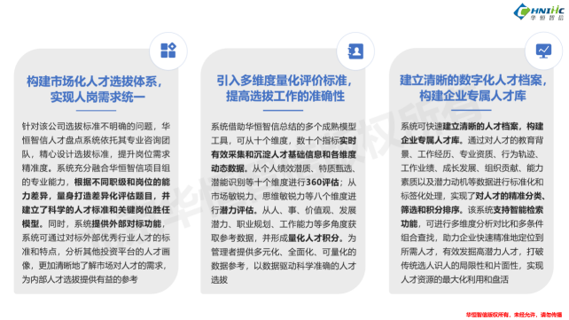 针对这些问题,华恒智信建议该企业借助人才盘点系统,构建市场化要求下的人才选拔体系,实现人岗需求统一;引入多维度量化评价标准,减少主观因素对人才选拔的影响,提高选拔工作的准确性;建立清晰的数字化人才档案,实现对人才快速精准地智能定位,充分应用人才盘点结果。