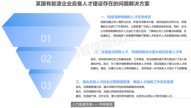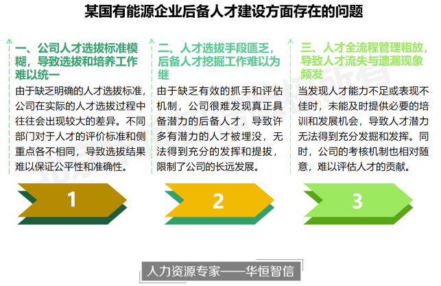 更为严峻的是,企业在后备人才培养方面的工作尚未到位,导致人才储备出现严重断层。由于公司长期以来主要关注经营发展,对管理基础的投入相对不足,特别是在人力资源管理方面存在明显短板。这使得企业在面临退休潮的压力下,难以迅速补充新鲜血液,导致人才青黄不接的问题愈发严重。因此,如何有效解决人才问题,已成为该能源企业亟待解决的重要任务。在此背景下,公司领导决定寻求专业第三方的帮助,在充分的市场调研后决定选择在业内享有盛名的华恒智信人力资源咨询公司进行合作,希望专家老师能够帮助公司优化后备人才管理体系,建立后备人才管理体系,盘活人才队伍,支持公司转型发展。