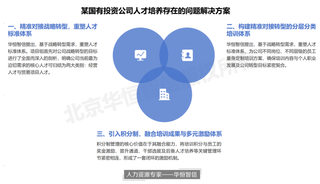 在本项目中,随着公司的转型发展,对员工的要求也发生了显著变化。由于该公司人才培养机制比较薄弱,因此出现了一些问题,比如员工能力短板显现,难以满足公司转型需求;培训内容脱节转型目标,难以为转型发展赋能;培训机制孤立运行,联动缺失致效果打折。针对这些问题,华恒智信提出,精准对接战略转型,重塑人才标准体系;构建精准对接转型的分层分类培训体系;引入积分制,融合培训成果与多元激励体系。