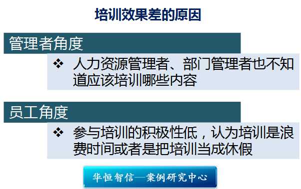 1、欠缺科学的培训需求分析,培训针对性差。该公园的人力资源管理基础工作较差,对各个岗位需要什么样的人才并不清楚,没有找到学员达成目标所需的能力和实际能力之间的差距,换言之,没有做到学员缺什么,就给他们补什么;各部门在年底做培训需求调查时,仅按照培训公司提供的课程清单选择课程,认为这门课有用,那门课时髦,就选择这些课程;将各部门的课程汇总起来即形成公司年度培训计划,而没考虑这样的课程体系是否能对提升员工的工作技能有所帮助,是否支撑企业战略及年度经营目标。