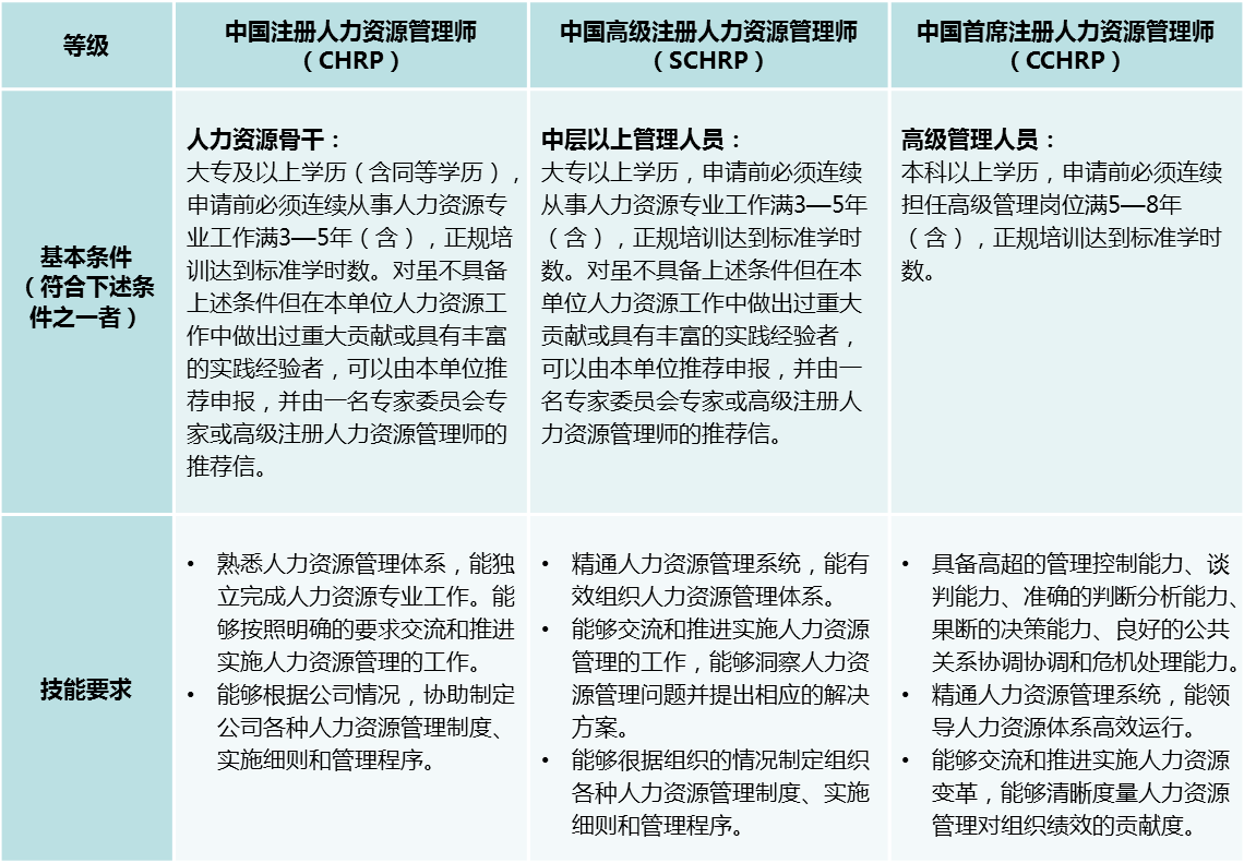 获得此证学员具备了人力资源管理工作的基本素质,熟悉人力资源领域的基本理论,并掌握相关领域人力资源管理实务,能够胜任人力资源领域的助理工作。
