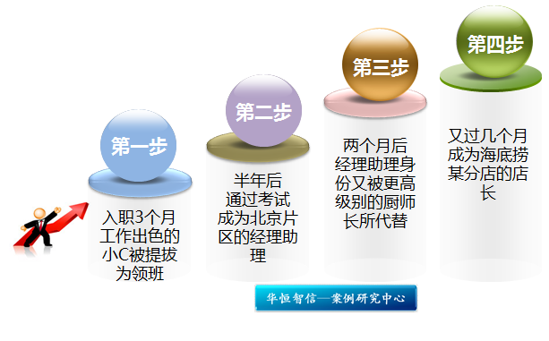 入职3个月后,工作出色的小C就被提拔为领班。半年后,她通过考试,成了北京片区的经理助理。两个月后,经理助理的身份又被更高级别的厨师长所代替。又过了几个月,小C已经成了海底捞某店的店长。一年多一点时间,小C的“连级跳”造就了一个晋升奇迹。