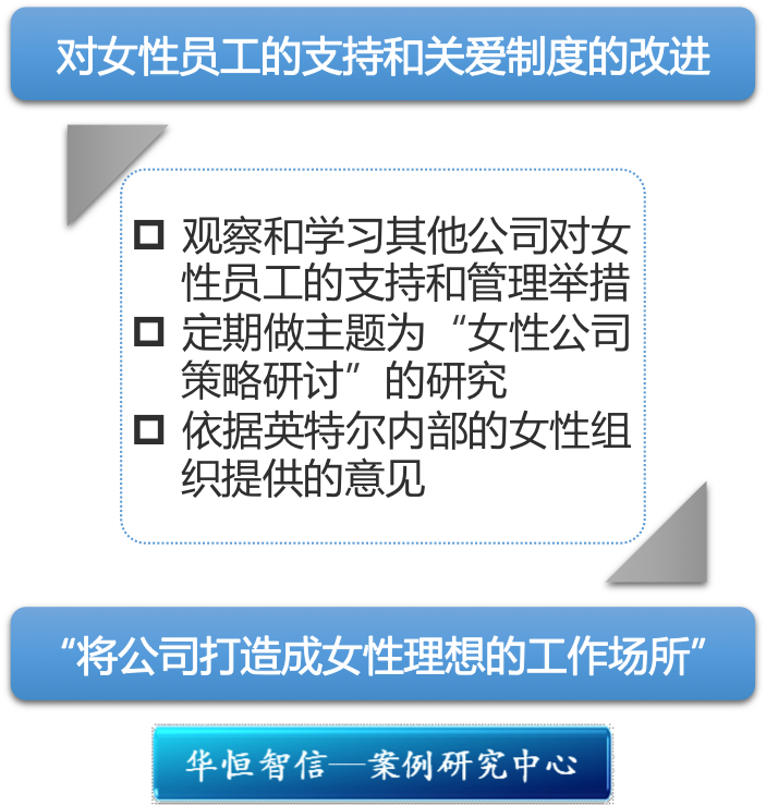 值得一提的是,英特尔还在研究如何持续改进对女性员工的支持和关爱制度。英特尔依据三方面来做持续改进:第一是观察和学习市场上其他公司对女性员工的支持和管理举措;第二,定期做主题为“女性公司策略研讨”的研究,看看还有哪些待改进之处;第三,依据英特尔内部的女性组织,如“Woman in Intel”、“女性网络计划”等提供的意见。
