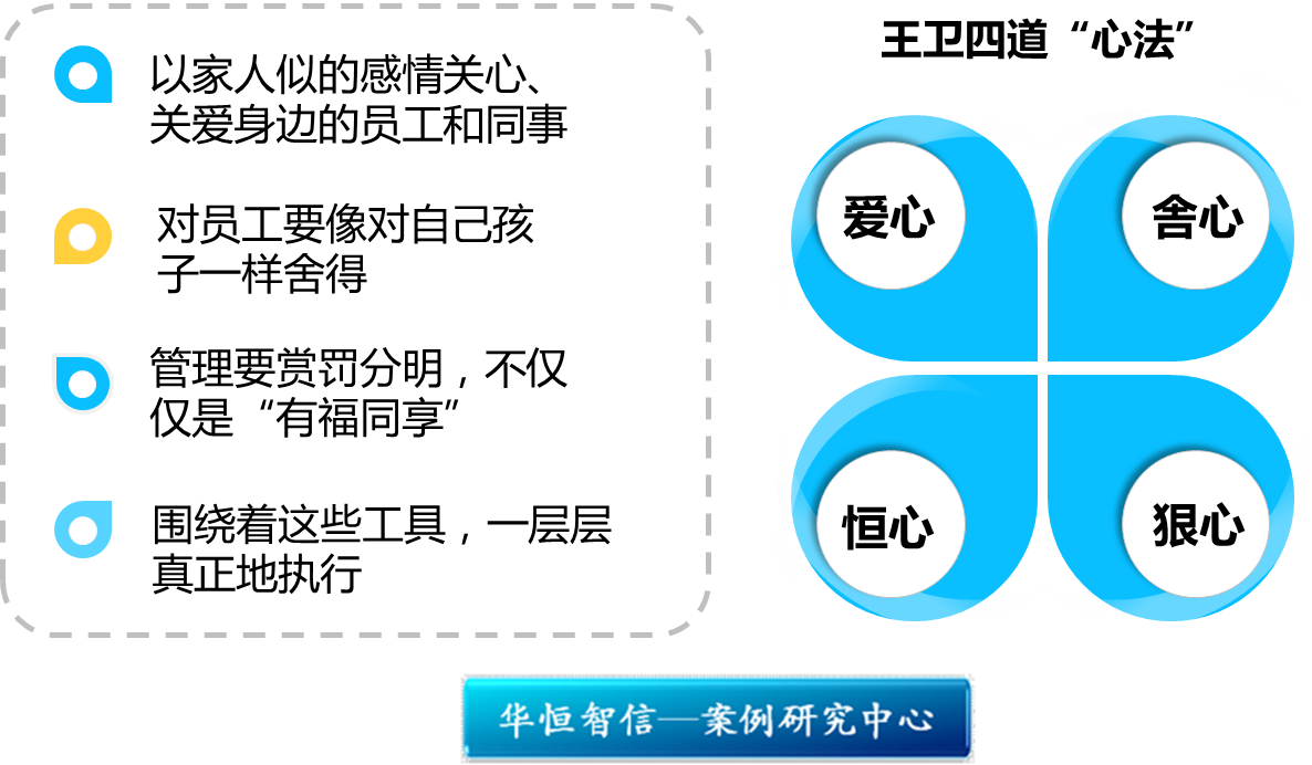 第三是狠心。王卫认为,管理员工并不是“有福同享”这么简单。好比父母对于子女的期待,领导者也会让员工接受历练,其中过程可能尤为辛苦。这样的狠心并非出于痛恨,而是爱心与舍心的结果。