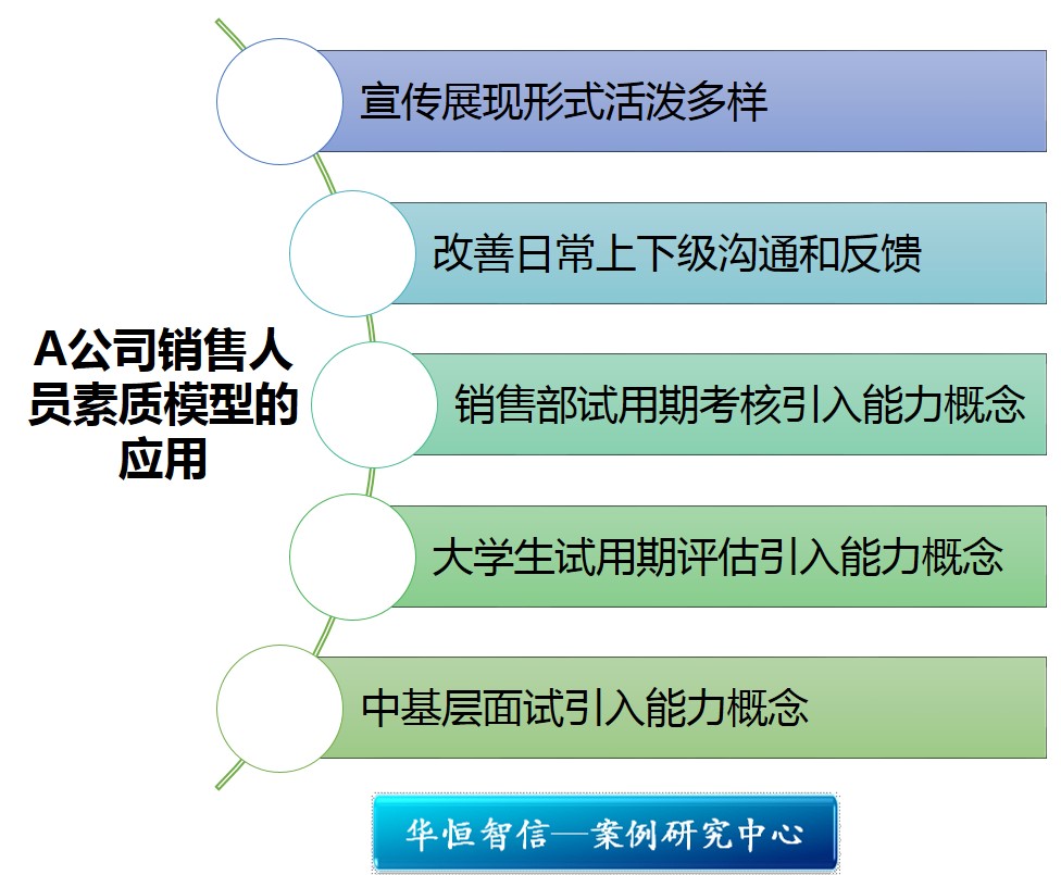 能力素质模型已经成为当今企业人力资源管理绕不开的一个话题。能力素质模型通常包括三类能力:通用能力、可转移的能力、独特的能力,这些行为和技能必须是可衡量、可观察、可指导的,并对员工的个人绩效以及企业的成功产生关键影响。开发能力素质模型对专业性的要求较高,如何开发一套对员工行为产生影响的有效素质模型是很多中小企业在思考的问题。案例中的A公司面临规模迅速扩张的局面时,从基层入手,由简洁循序渐进,开发了适合该公司销售人员的素质模型。华恒智信分析员总结出以下几点提供给企业管理者参考: